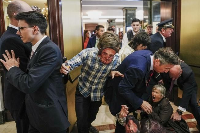 17/05/2023. Uns activistes irrompen a l'acte de lliurament dels XXXIII Premis de l'Energia, en què intervé la ministra per a la Transició Ecològica, Teresa Ribera, a Madrid. Aquests guardons són concedits pel Club Espanyol de l'Energia. / Foto: Borja Sánchez-Trillo / Efe.