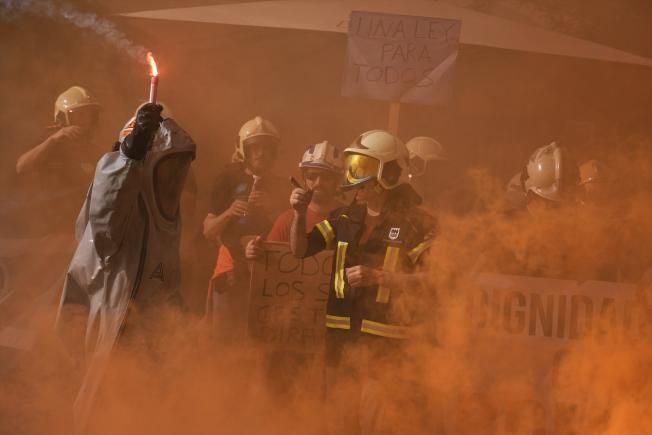 16/05/2023. Desenes de bombers protesten durant una manifestació de bombers amb fi al Congrés dels Diputats, a Madrid. Més de 5.000 bombers s'han manifestat per protestar contra "situacions kafkianes" provocades per la manca de coordinació i que deriven de la manca d'una Llei estatal marc que estableixi les funcions d'aquest col·lectiu. Els bombers exigeixen que en cas d'emergència acudeixin efectius del parc de bombers més proper, sense dependre de la distribució territorial i deixant de banda les competències autonòmiques. A més, han denunciat la descoordinació que pateixen a l'hora d'operar o gestionar incendis i altres emergències. / Foto: Fernando Sánchez / Europa Press.