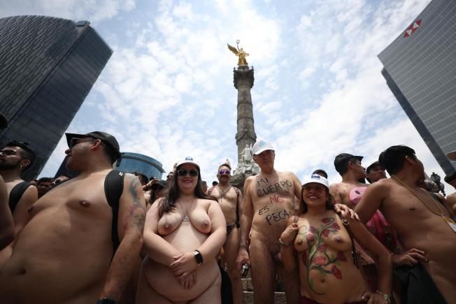 20/05/2023. Diverses persones participen a la primera manifestació "Dia al nu", en carrers de la Ciutat de Mèxic. Desenes de mexicans van encapçalar el primer “Dia al Nu” a la Ciutat de Mèxic per normalitzar el cos en el seu estat natural. Almenys unes 200 persones es van donar cita a la rotonda de la Cibeles i van caminar només amb calçat fins a l'Àngel de la Independència, sobre l'avinguda Passeig de la Reforma. / Foto: Sáshenka Gutiérrez / Efe.