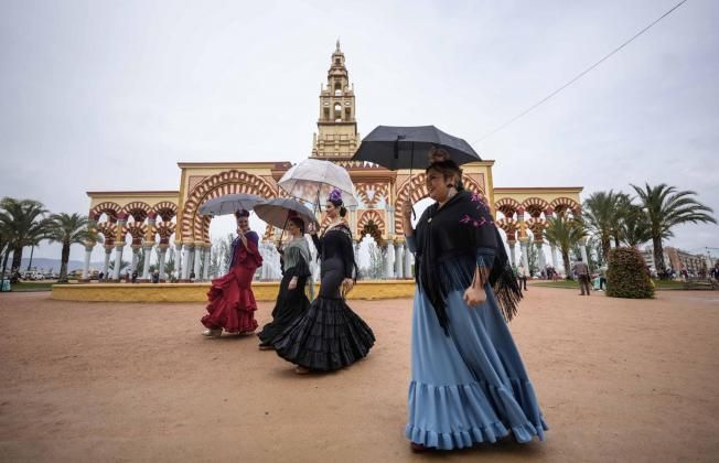 23/05/2023. Unes dones vestides de flamenques es protegeixen de la pluja mentre passegen per la portada de la fira de la Mare de Déu de la Salut, a Còrdova. / Foto: Rafa Alcaide / Efe.