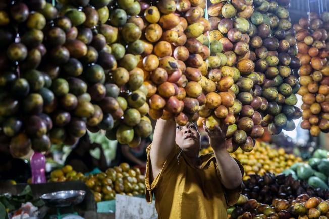 28/05/2023. Una venedora de fruites espera els clients en un mercat tradicional de fruites a Berastagi. Situat a una altitud de 1.300 metres sobre el nivell del mar, Berastagi és una de les ciutats més fredes d'Indonèsia i un dels majors productors de fruites i verdures a la província de Sumatra del Nord. / Foto: Dedi Sunuhaji / Efe.