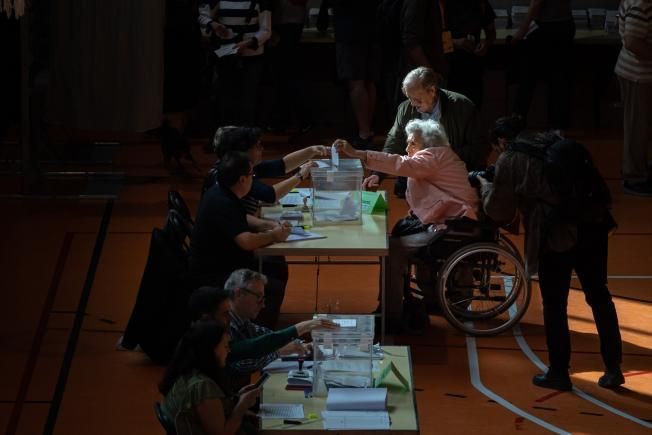 28/05/2023. Una persona gran en cadira de rodes exerceix el dret al vot a l'Escola Grèvol, a Barcelona. Les eleccions municipals s'han celebrat en un total de 8.131 ajuntaments i eleccions autonòmiques a 12 comunitats autònomes. A les eleccions municipals podran votar 35.414.655 electors i a les autonòmiques que se celebren podran fer-ho 18.382.505 electors. / Foto: Kike Rincó / Europa Press.