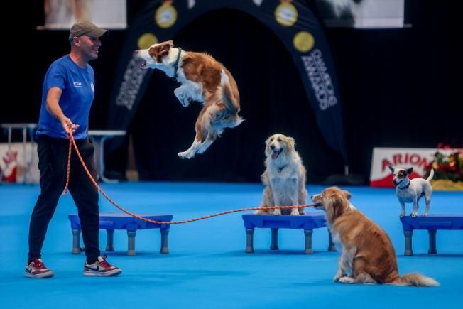 27/05/2023. Un participant i els seus gossos durant la XXXIX Exposició Internacional Canina de Tardor Latin Winner del Mad Dog Show, al recinte firal de la Fira de Madrid. Organitzada per la Reial Societat Canina d'Espanya, la Mad Dog Show aplega 2.000 criadors i 3.000 gossos de 200 races diferents. Aquest any Mad Dog Show lliura també el trofeu de Sa Majestat la Reina Sofia al millor can internacional amb el qual vol agrair el compromís de Senyora Sofía amb els gossos i el seu suport i defensa d'aquests. / Foto: Ricardo Rubio / Europa Press.