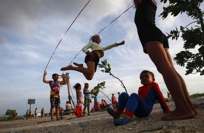 30/05/2023. Diversos nens juguen a la costa de Manila. El tifó Mawar ha provocat fortes pluges al nord del país, després de frenar el seu avenç i quedar estancat davant de la costa nord-oriental de l'arxipèlag amb una intensitat i velocitat decreixents. / Foto: Francis R. Malasig / Efe.