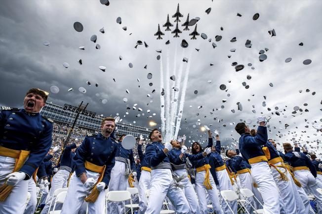 01/6/2023. Els cadets de l'Acadèmia de la Força Aèria dels EUA celebren llançant les seves cobertes a l'aire mentre l'esquadró de demostració aèria Thunderbirds de la USAF fa un sobrevol durant la graduació dels cadets al Falcon Stadium. / Foto: Trevor Cokley / Europa Press.
