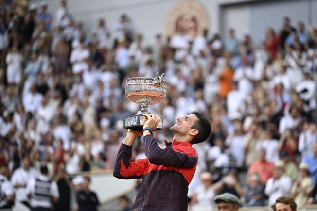 11/06/2023. Novak Djokovic amb el trofeu ("La Coupe des Mousquetaires") després de guanyar la final del Roland Garros. / Foto: Victor Joly / Europa Press.