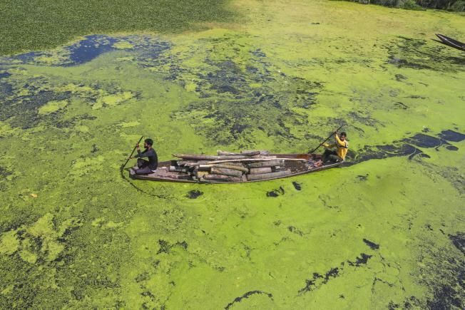 20/06/2023. Uns homes a bord d'un pot carregat amb troncs remen al llac Dal a Srinagar, la capital d'estiu del Caixmir índia. Les autoritats índies estan destinant mitjans per netejar aquest llac d'algues i males herbes. / Foto: Farooq Khan / Efe.