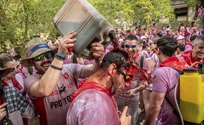 29/06/2023. Uns 6.000 "guerrers" es llencen uns 30.000 litres de vi com a "arma" durant la tradicional Batalla del Vi, declarada Festa d'Interès Nacional, a la ciutat de La Rioja d'Haro. / Foto: Fernando Díaz / Efe.