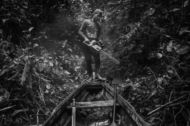 Jasson Oliveira, un resident de la Reserva Extractiva Arapixi a l'Amazònia brasilera, utilitza una motoserra per netejar el camí de la seva canoa en el seu camí per recollir nous del Brasil. La reserva es va establir l'any 2006 com una àrea protegida amb un ús sostenible dels recursos naturals, per salvaguardar els mitjans de vida i la cultura de la població extractiva tradicional. L'objectiu era protegir la zona contra el cultiu de soja a gran escala i la ramaderia, però actualment està sent envaïda per acaparadors de terres, que estan desforestant la selva i amenaçant la forma de vida de les 300 famílies que hi viuen. / Foto: Lalo de Almeida.